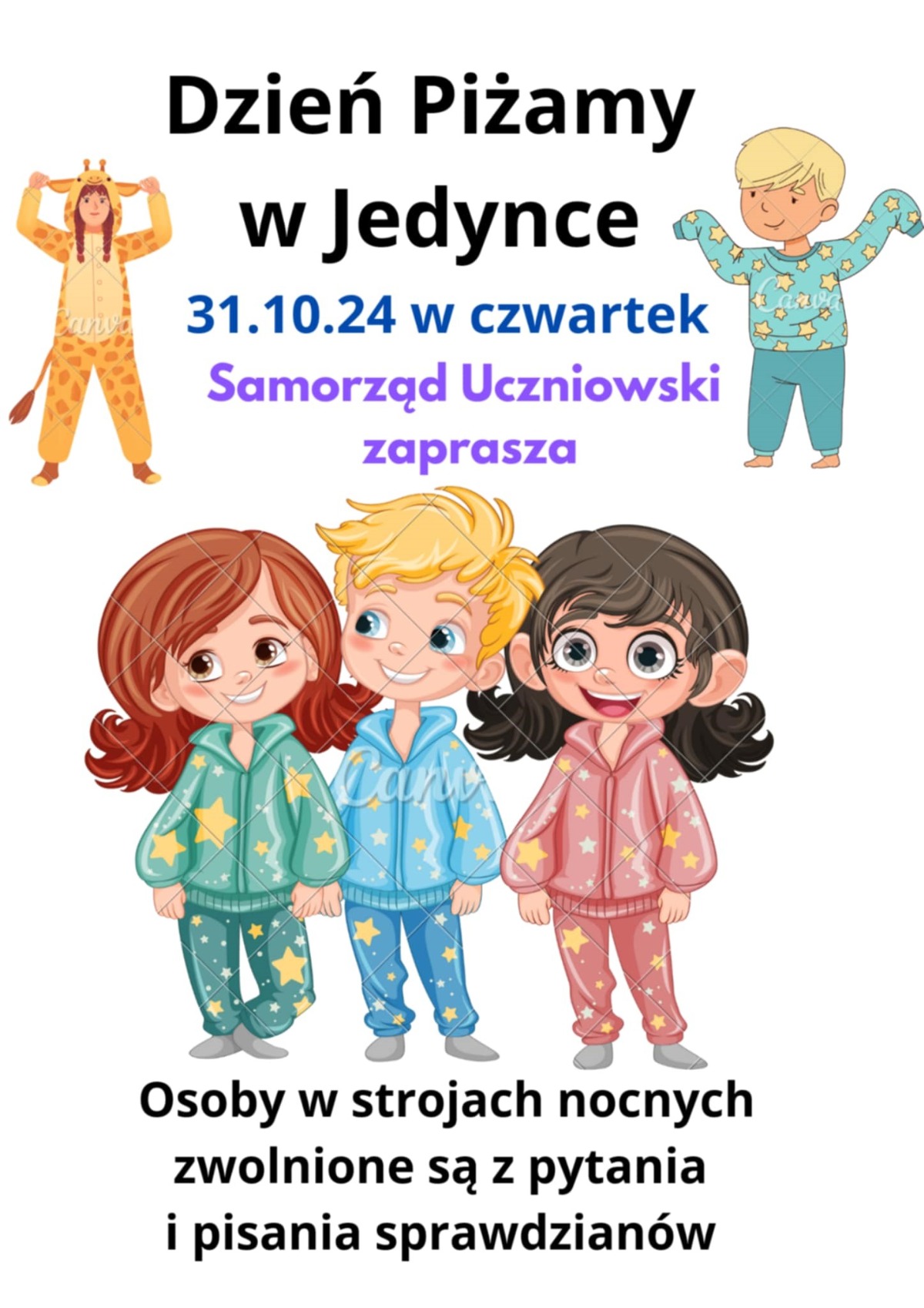 Samorząd Uczniowski serdecznie zaprasza wszystkich uczniów i nauczycieli na wyjątkowy Dzień Piżamowy! Kiedy? W czwartek, 31.10.2024 r. Gdzie? W naszej szkole, we wszystkich klasach. W ten dzień możecie zostawić swoje ulubione i eleganckie stroje w domu – zamiast tego przyjdźcie do szkoły w ulubionych piżamach! To świetna okazja, by uczcić dzień w atmosferze relaksu, zabawy i przyjaźni! Nie może Cię zabraknąć – bądź z nami i świętuj ten dzień w najwygodniejszym stroju! Osoby w nocnych strojach zwolnione są z pytania i pisania sprawdzianów! Do zobaczenia! #DzieńPiżamowy #SamorządUczniowski #ZabawaWSzkole