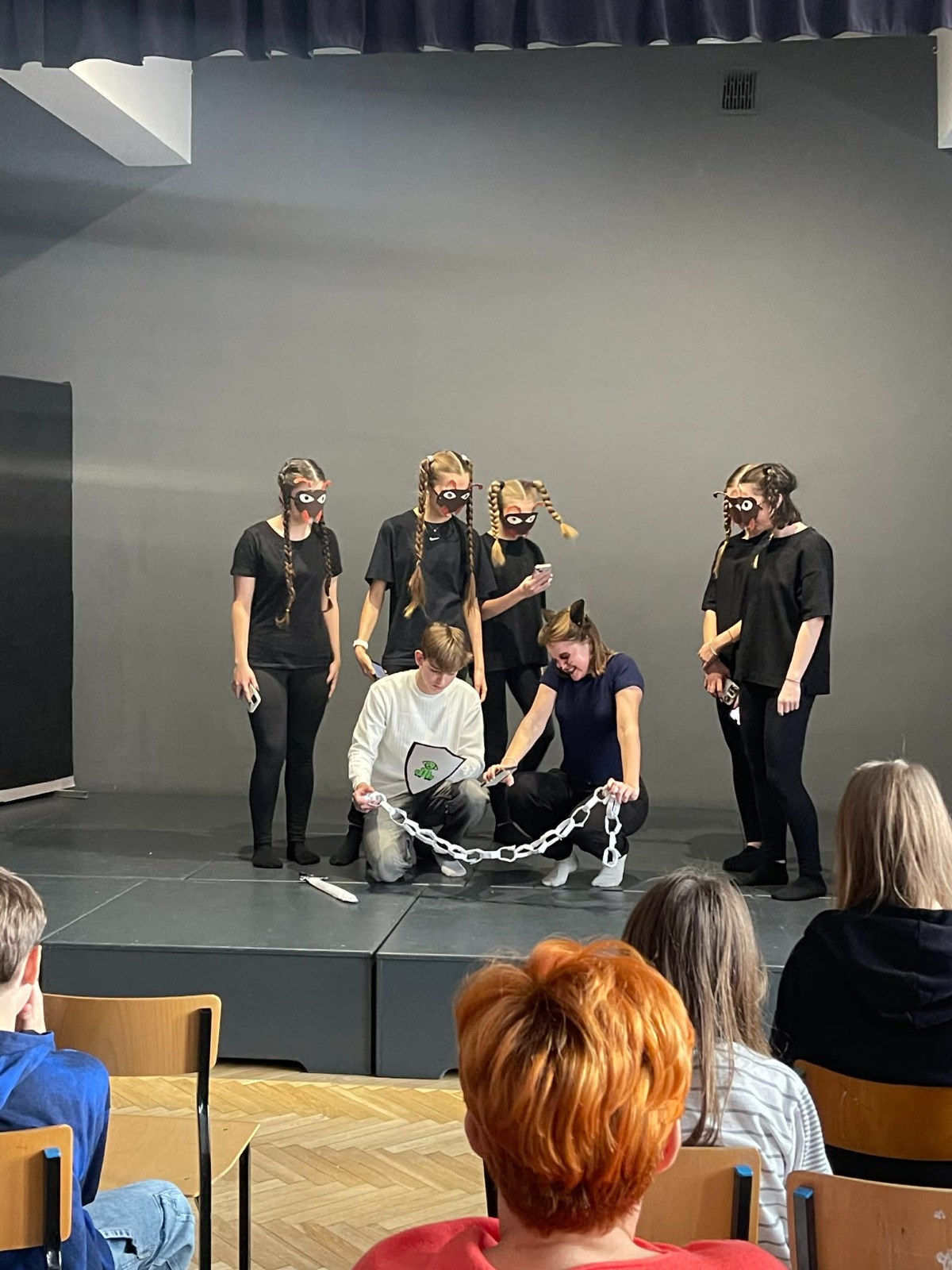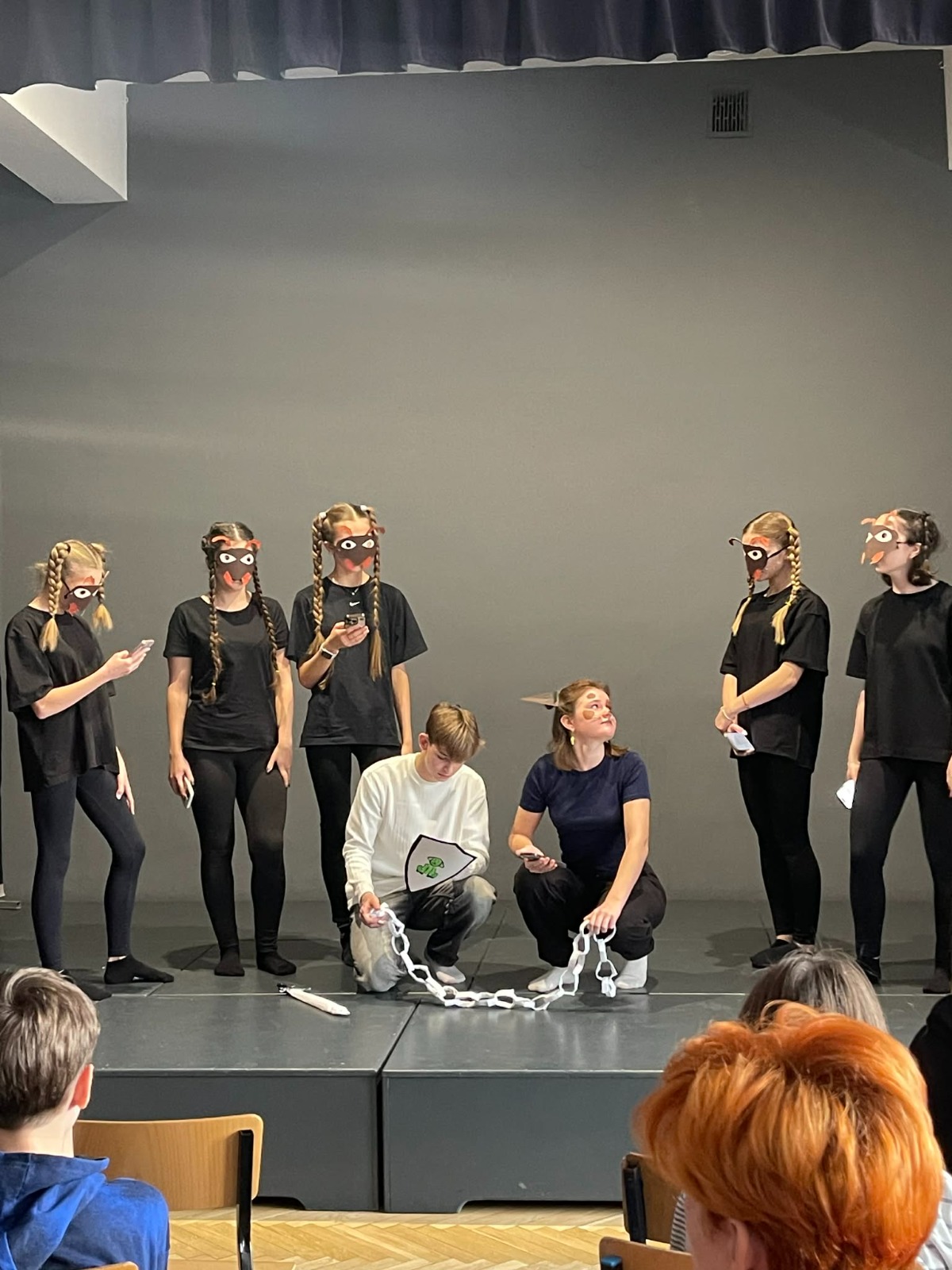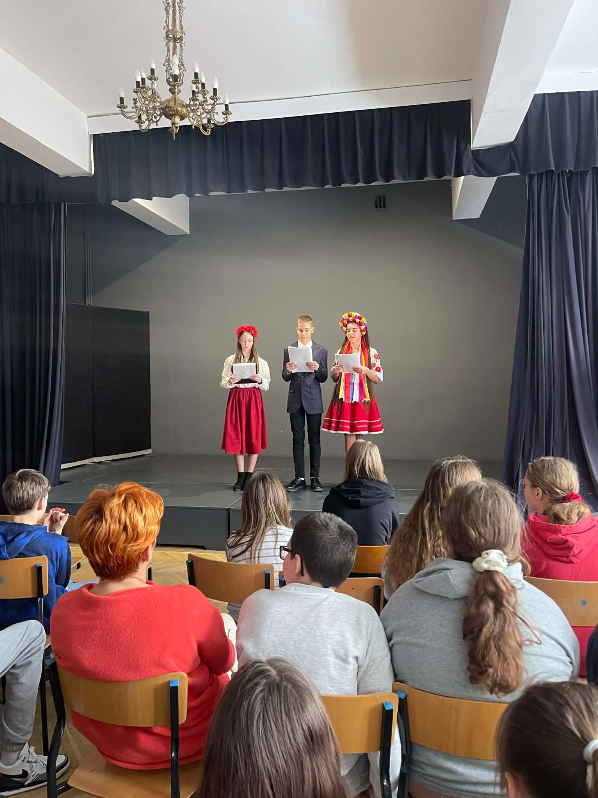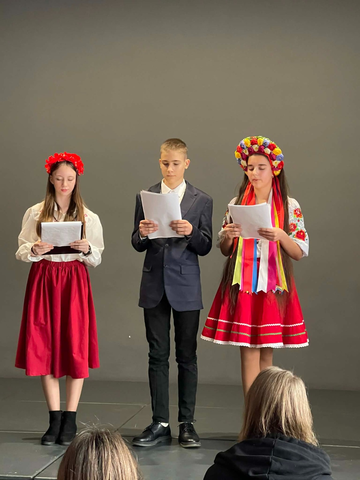 Pokaz otwierała grupa uczniów z klasy 7a, pod kierunkiem p. Honoraty Podgórskiej, pierwszą sceną przeczytaną po polsku, a dzieci z Ukrainy kontynuowały w języku ukraińskim.