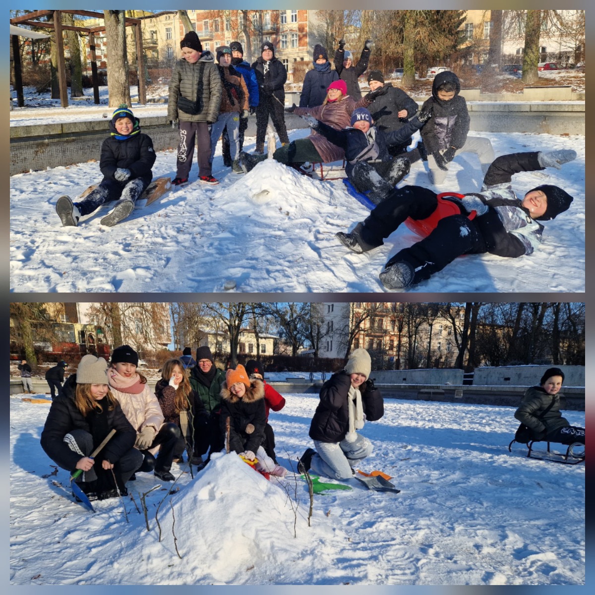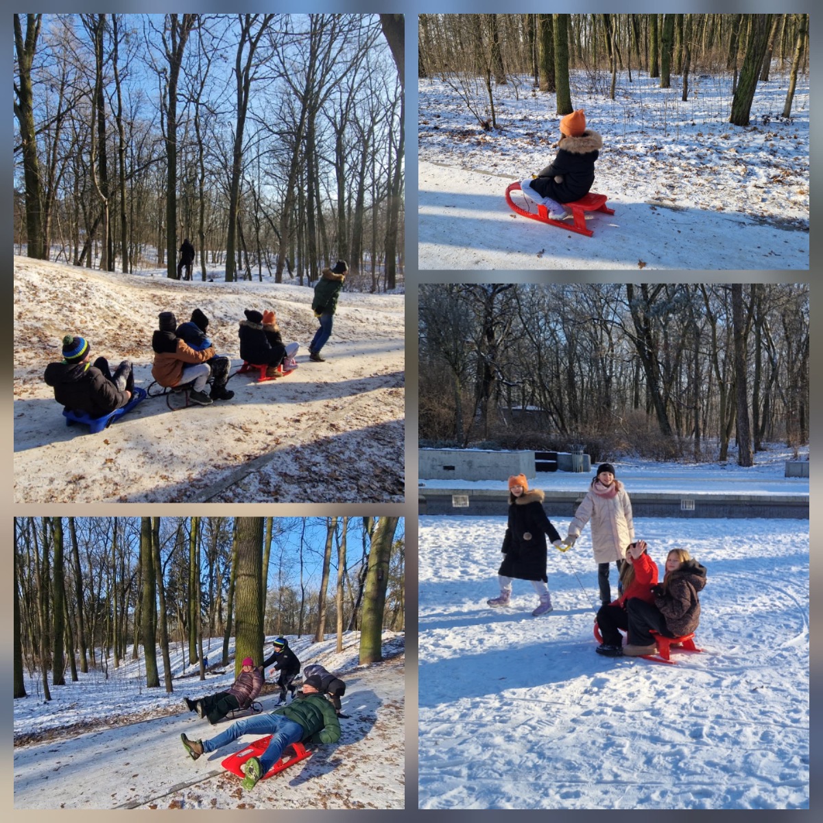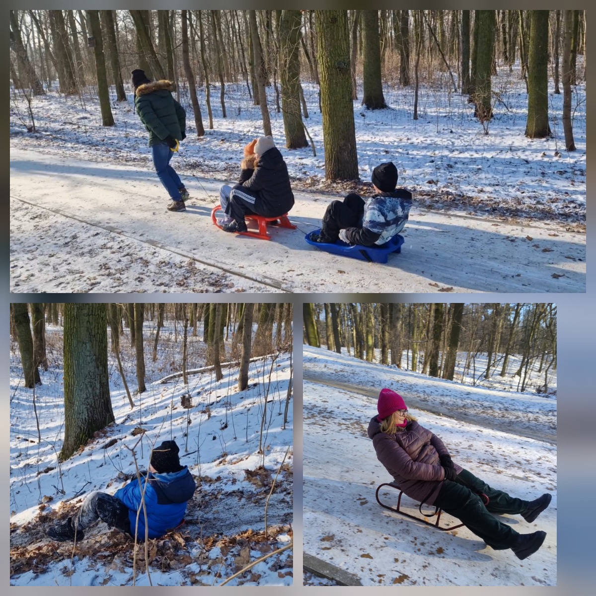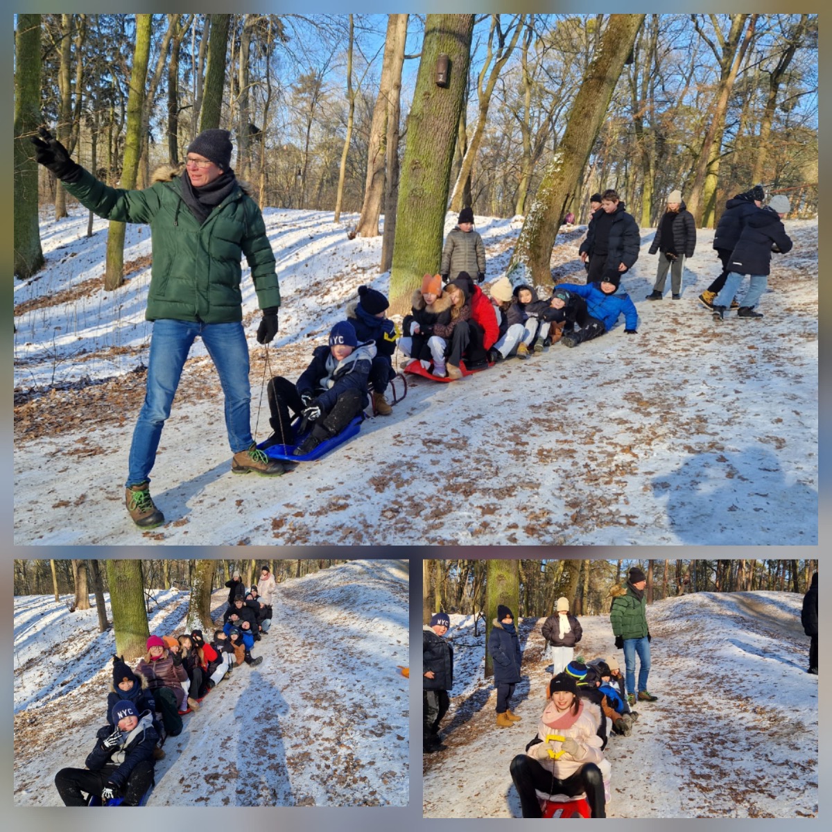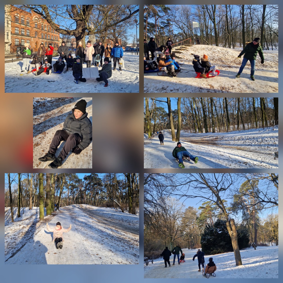Z górki zjeżdżaliśmy na sankach, jabłuszkach, a nawet na desce toaletowej przygotowanej przez panią Grażynkę z portierni. Największym mistrzem zjazdów okazał się pan Darek, który dzielnie ciągnął całą ekipę – było mnóstwo śmiechu, zabawy i integracji