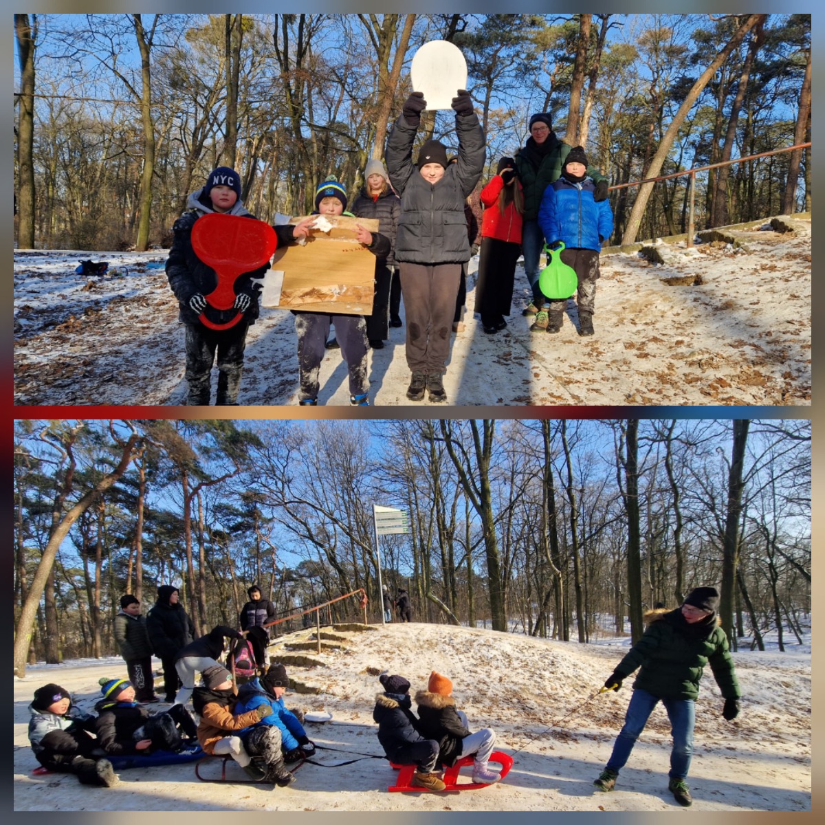 Zabraliśmy ze sobą wszystko, co było potrzebne do zimowych przygód: sanki (także te własnoręcznie skonstruowane przez Patryka przy pomocy pana Krzysia ), łopaty, szufelki i… ogromne pokłady dobrej energii