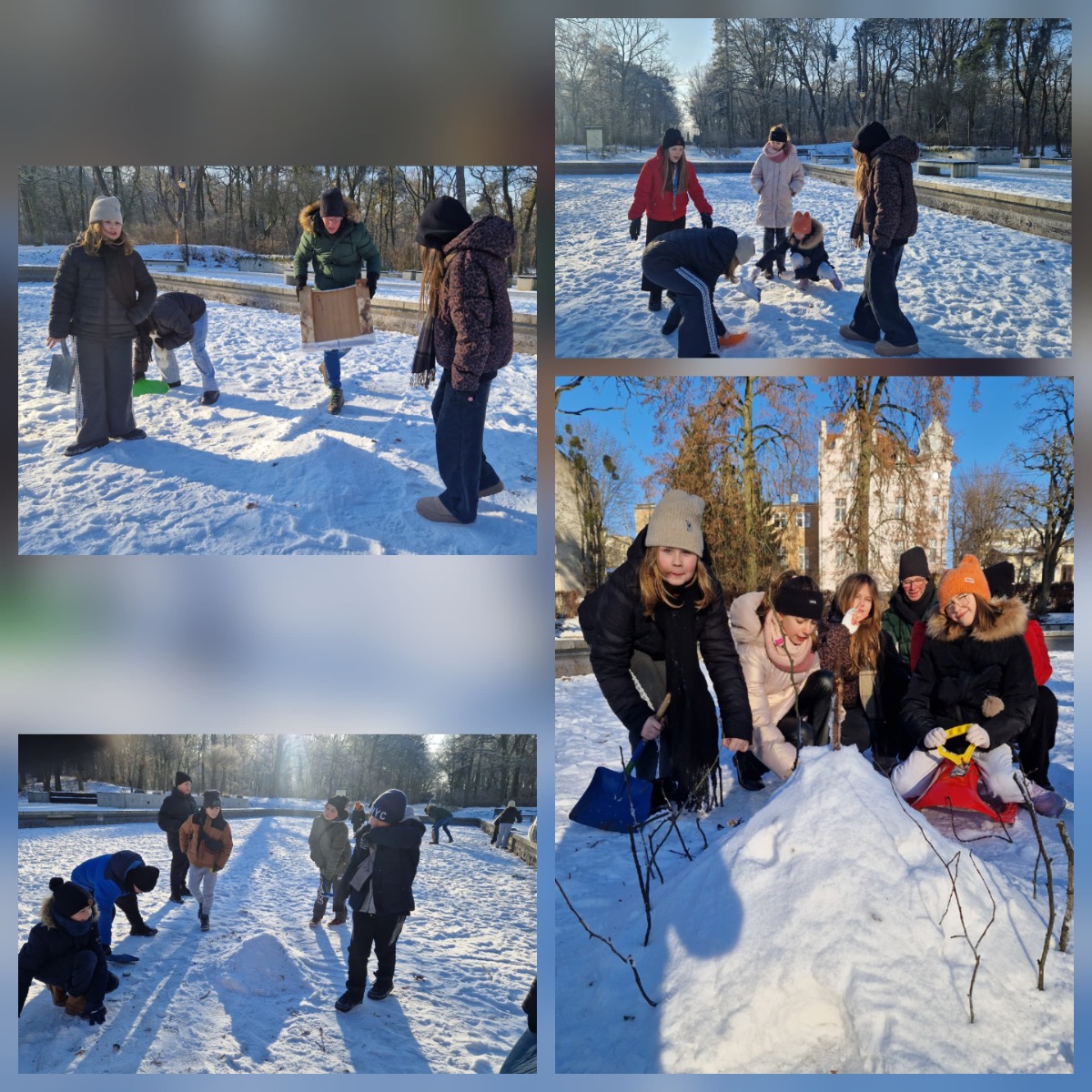 Podczas zajęć lepiliśmy Pałac Białej Czarownicy – był to wstęp do omawiania lektury „Opowieści z Narnii” . Rozmawialiśmy o roli Białej Czarownicy, jej znaczeniu w utworze oraz o tym, na co zwracać uwagę podczas czytania lektury . Choć śnieg był sypki i nie zawsze współpracował , dzięki łopatom i szufelkom od pana Krzysia praca twórcza poszła nam znakomicie!