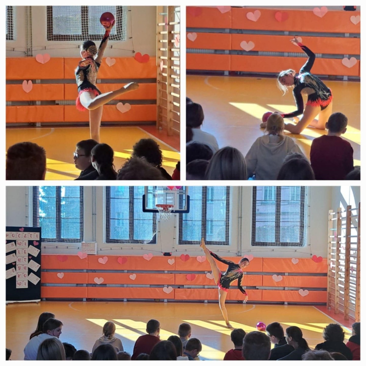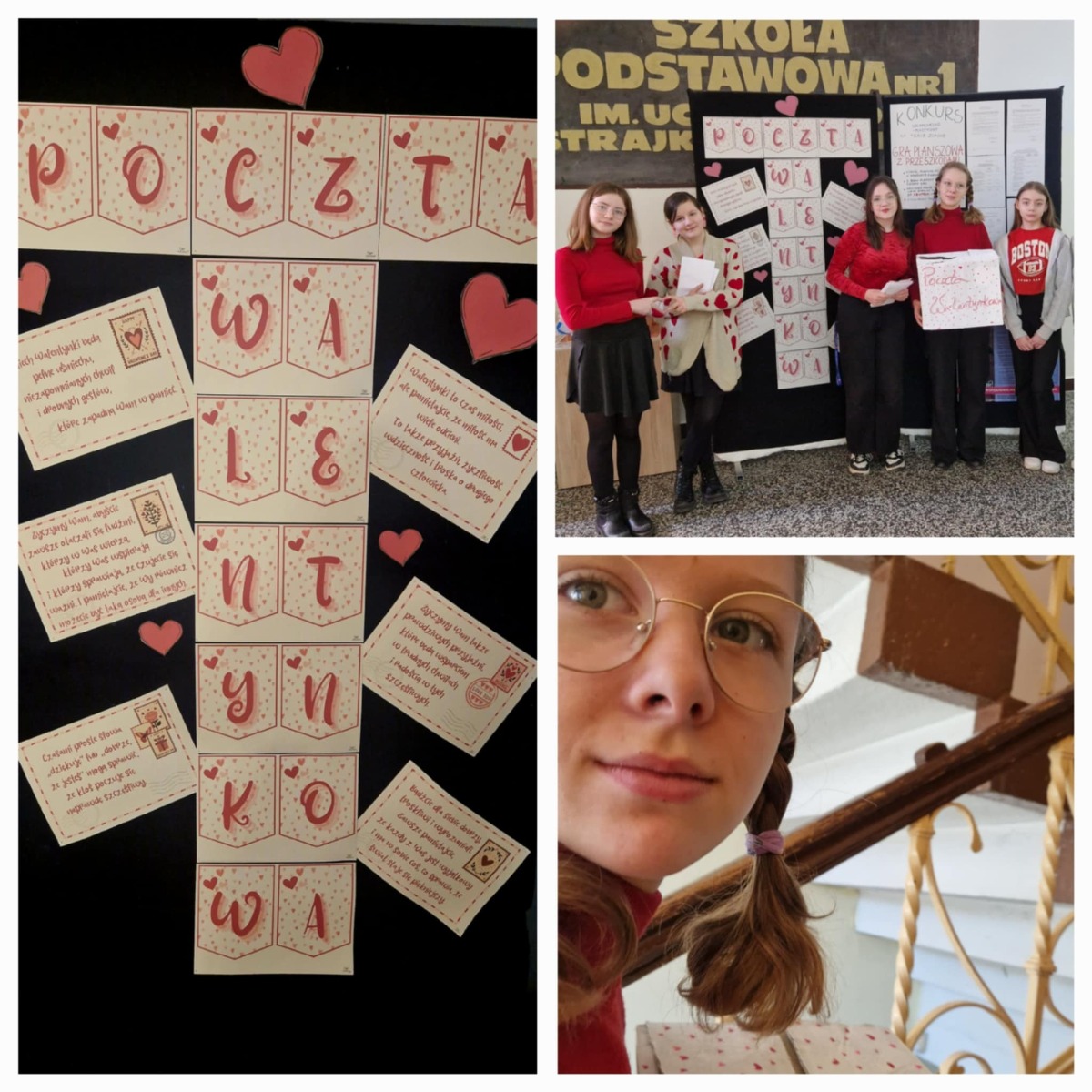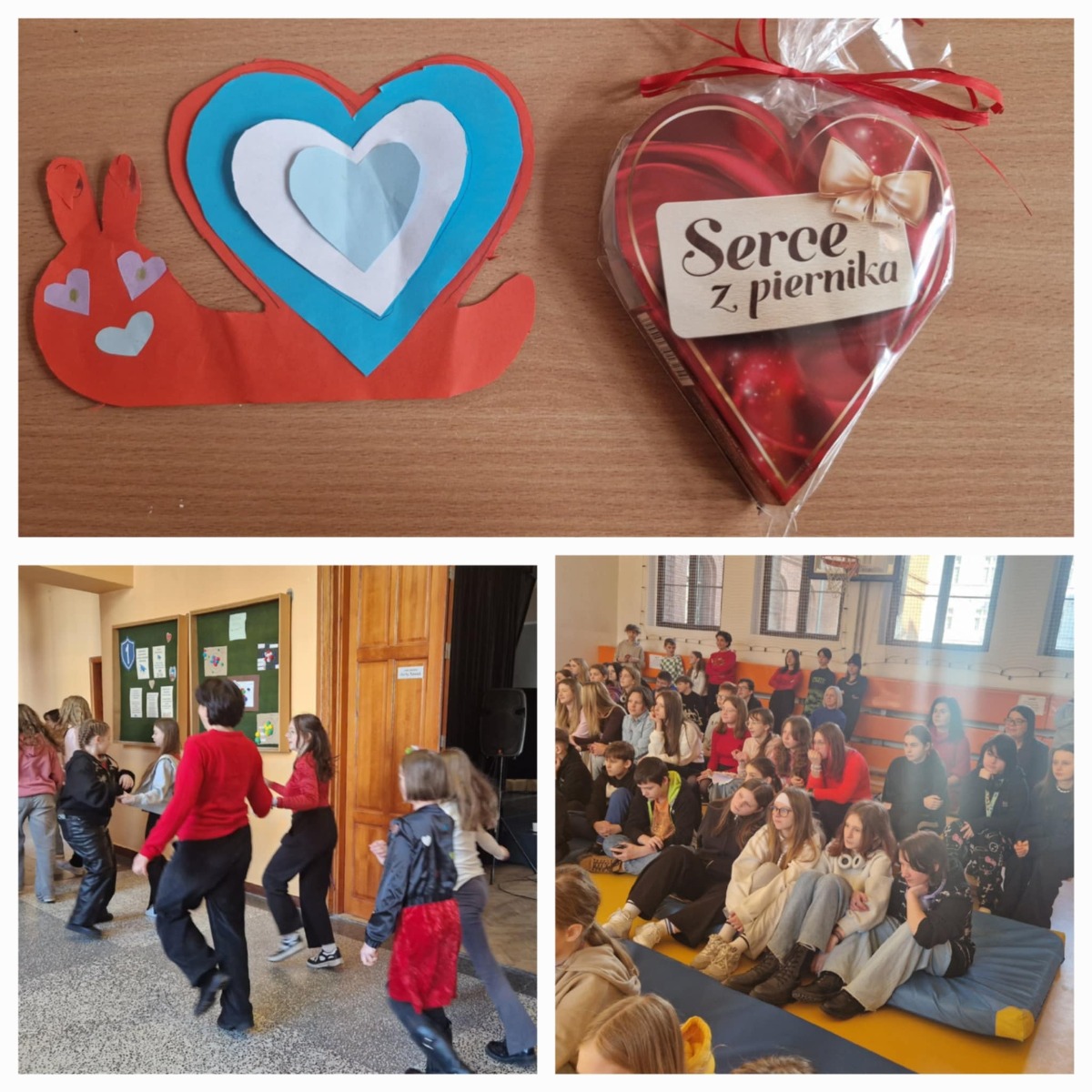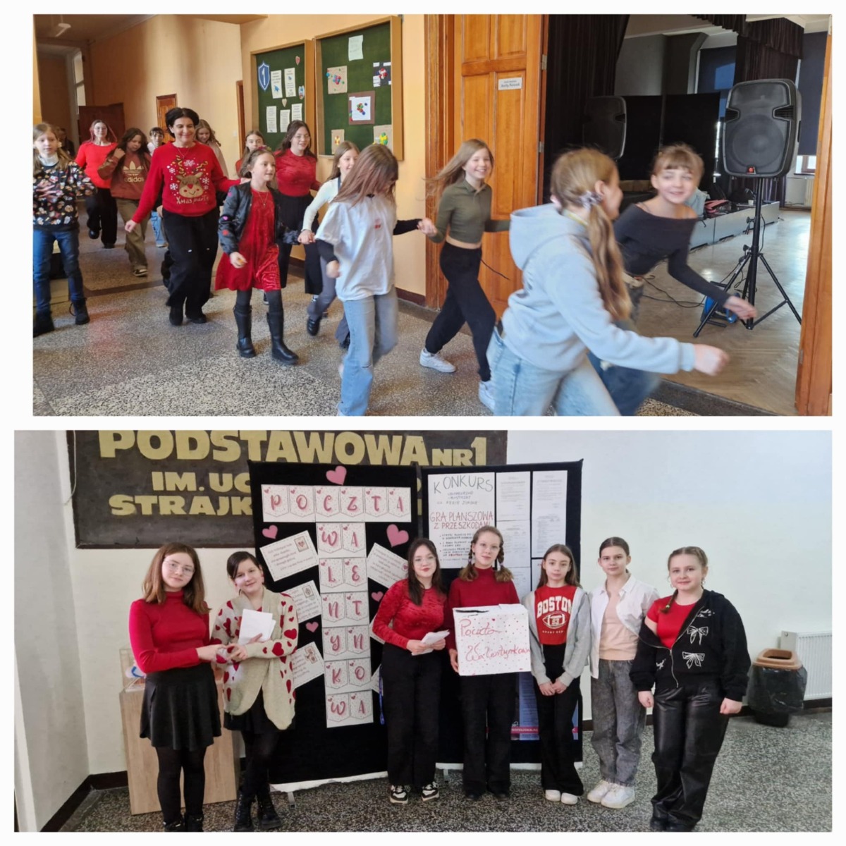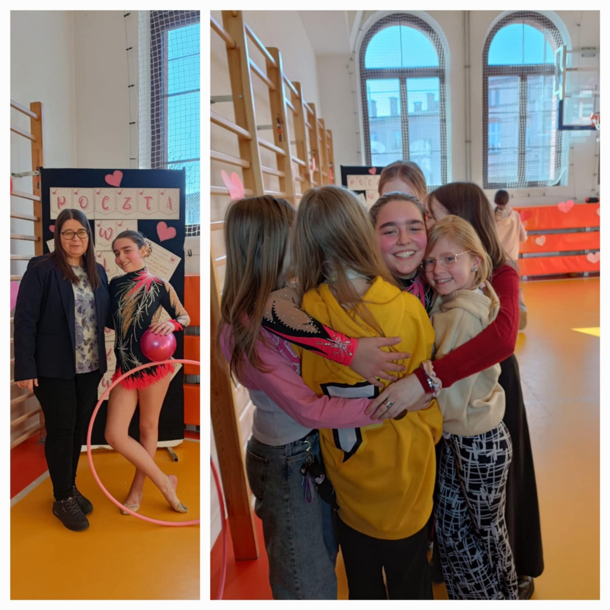 Dziś w naszej szkole miłość unosiła się w powietrzu!  Od rana Samorząd Uczniowski zadbał o wyjątkową atmosferę – na przerwach rozbrzmiewały romantyczne utwory, a wspólna belgijka  dodała wszystkim energii! Nie mogło zabraknąć Poczty Walentynkowej , dzięki której szkolne walentynki trafiły w odpowiednie ręce, wywołując mnóstwo uśmiechów.  Największą atrakcją był niesamowity występ akrobatyczny  Yevy Skok z klasy 6a, która zachwyciła nas swoimi umiejętnościami z kołem i piłką!  Ale miłość kwitła nie tylko na przerwach, lecz także na lekcjach!  Na języku polskim pisaliśmy zaproszenia na walentynki, odmienialiśmy „miłość” przez przypadki i słowo „kochać” przez wszystkie czasy.  Na angielskim obchodziliśmy Valentine’s Day, poznając nowe słownictwo związane z uczuciami.  Bo miłość to ważne uczucie, które warto wykorzystywać nie tylko w życiu, ale i… podczas nauki!  W końcu motyw miłości to jeden z kluczowych tematów na egzamin ósmoklasisty!  To był dzień pełen wrażeń, który spędziliśmy w cudownej atmosferze!  Życzymy wszystkim uczniom, nauczycielom, pracownikom szkoły oraz Pani Dyrektor pięknych Walentynek!  Pamiętajcie, że Walentynki to nie tylko święto zakochanych, ale także czas, by okazać miłość i wdzięczność naszym bliskim – rodzicom, dziadkom, rodzeństwu i przyjaciołom!