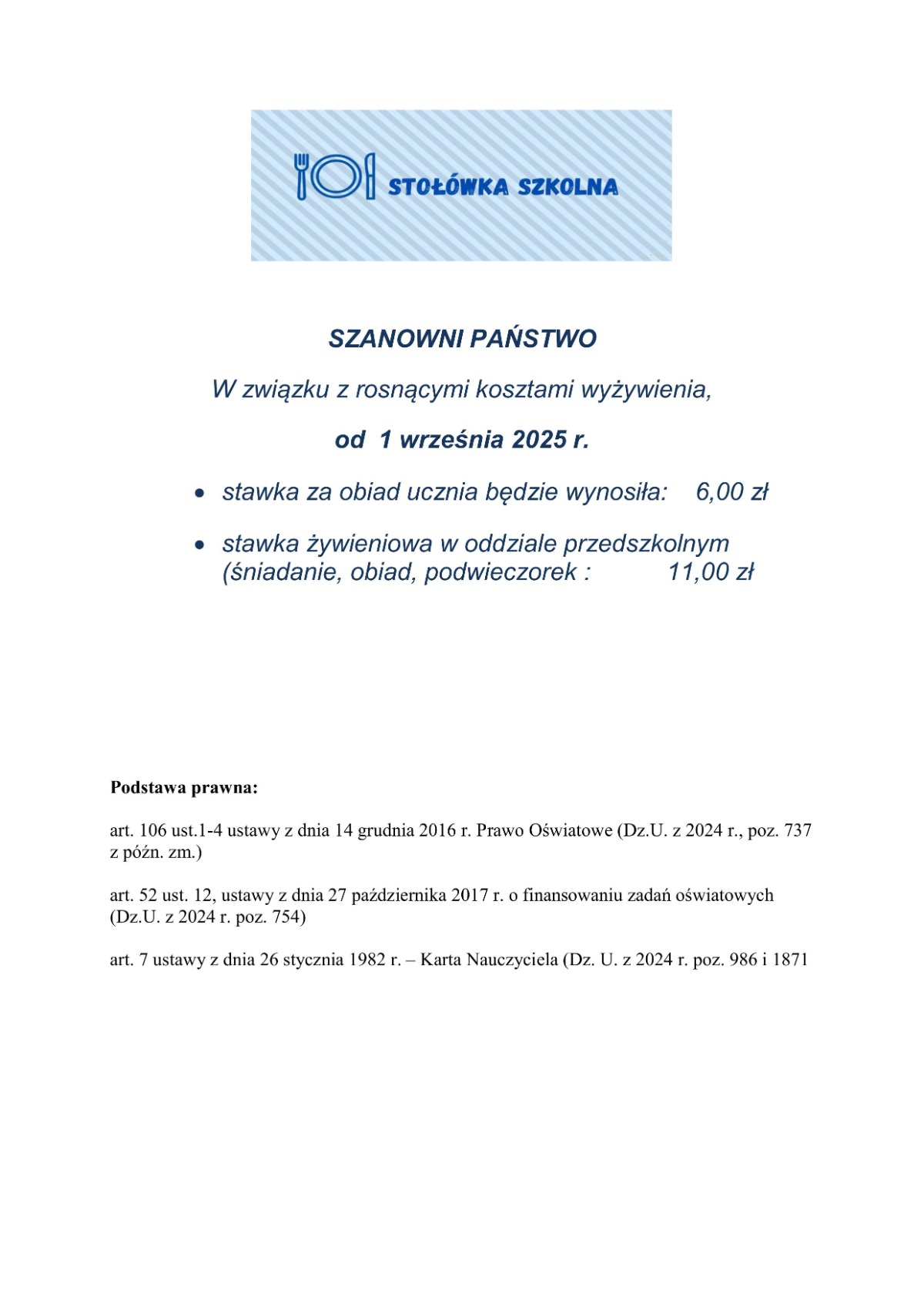 Zmiana sposobu i warunków wnoszenia opłat za obiady w szkole oraz wyżywienie i czesne w oddziałach przedszkolnych.